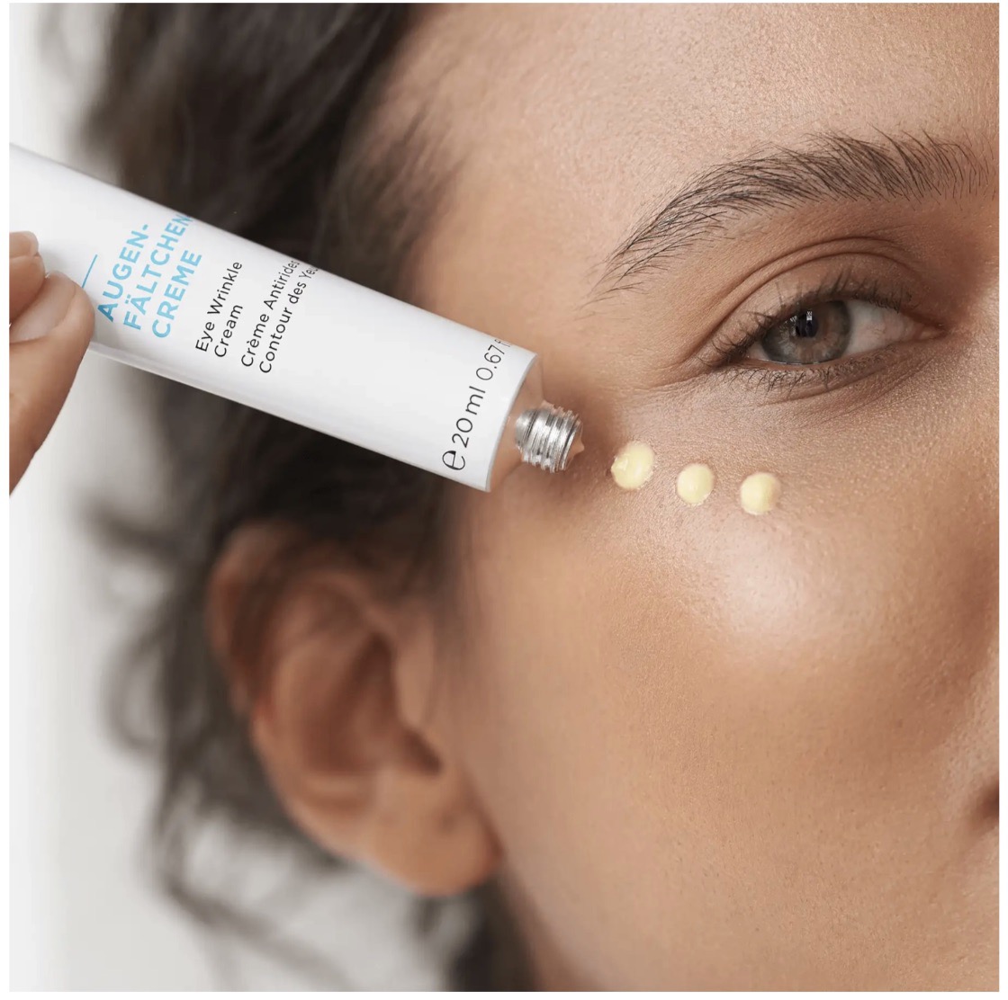 Morgens und abends auf die gereinigte Augenpartie auftragen und sanft einmassieren.