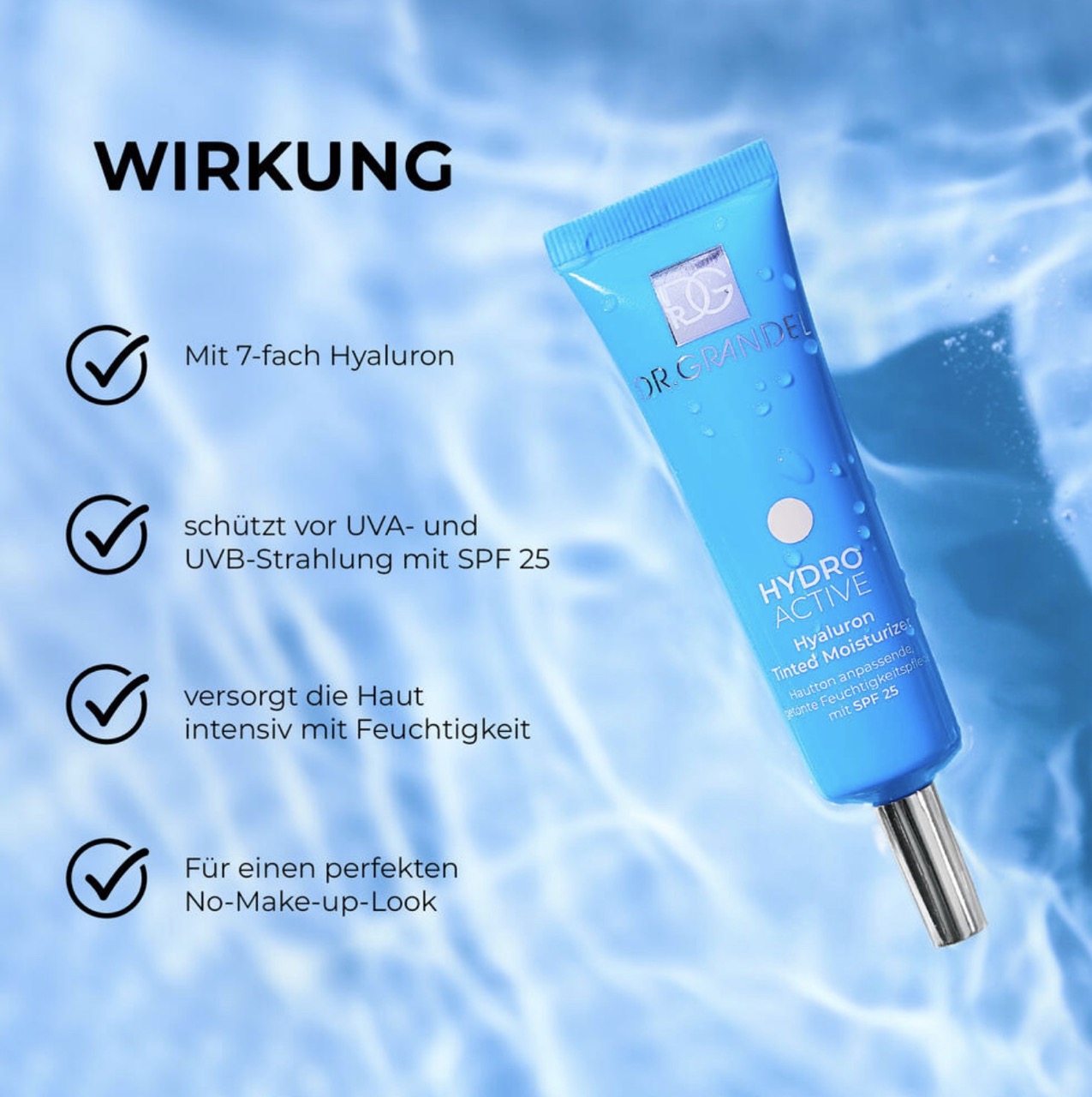 DR. GRANDEL HYDRO ACTIVE Hyaluron Tinted Moisturizer SPF 25 kombiniert Feuchtigkeitspflege mit Sonnenschutz und optimiert den Hautton. Die leichte Textur ist für alle Hauttypen geeignet, zieht schnell ein und hinterlässt ein gepflegtes, durchfeuchtetes Hautgefühl. Intensiver Feuchtigkeits-Kick für die Haut.