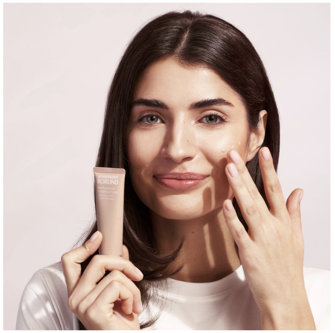 Eine kleine Menge NATUWEAR FOUNDATION mit den Fingerspitzen beider Hände gleichmäßig im Gesicht verteilen. Beim Auftragen mit einem Pinsel oder Schwamm von der Mitte des Gesichtes nach Außen verblenden.