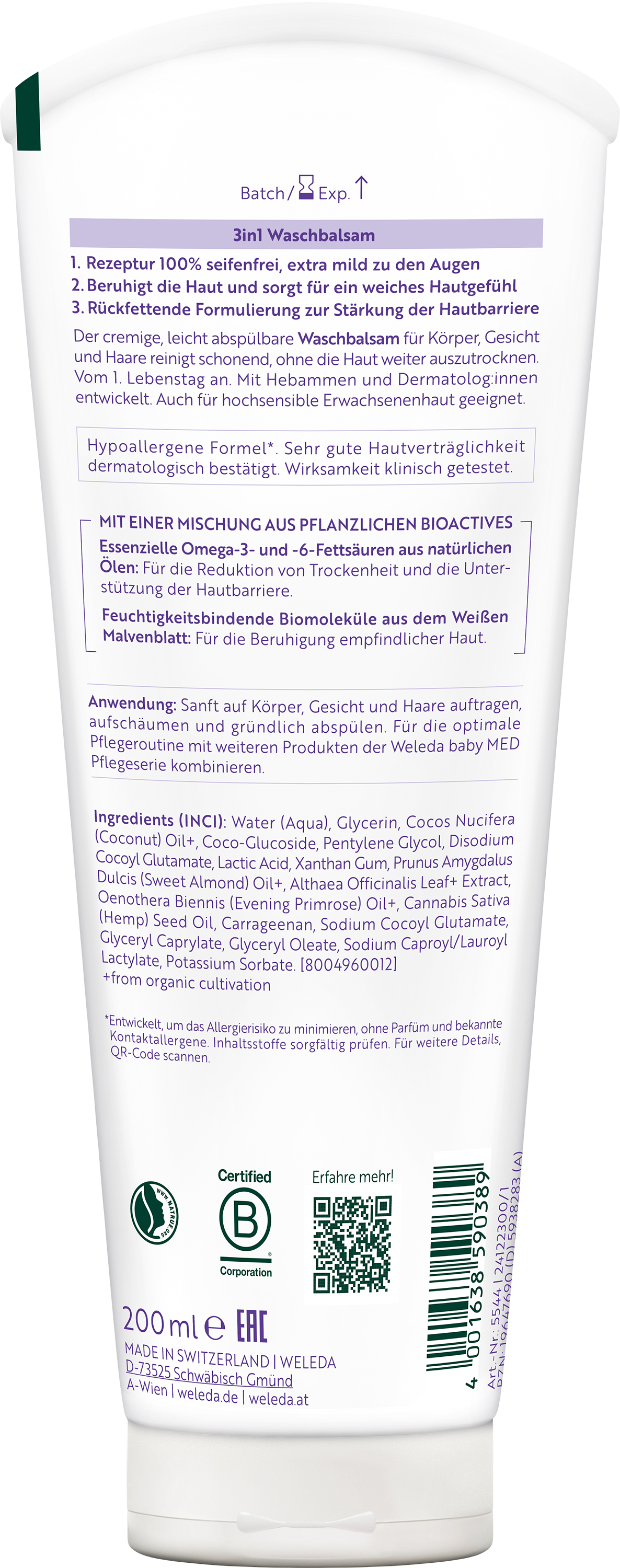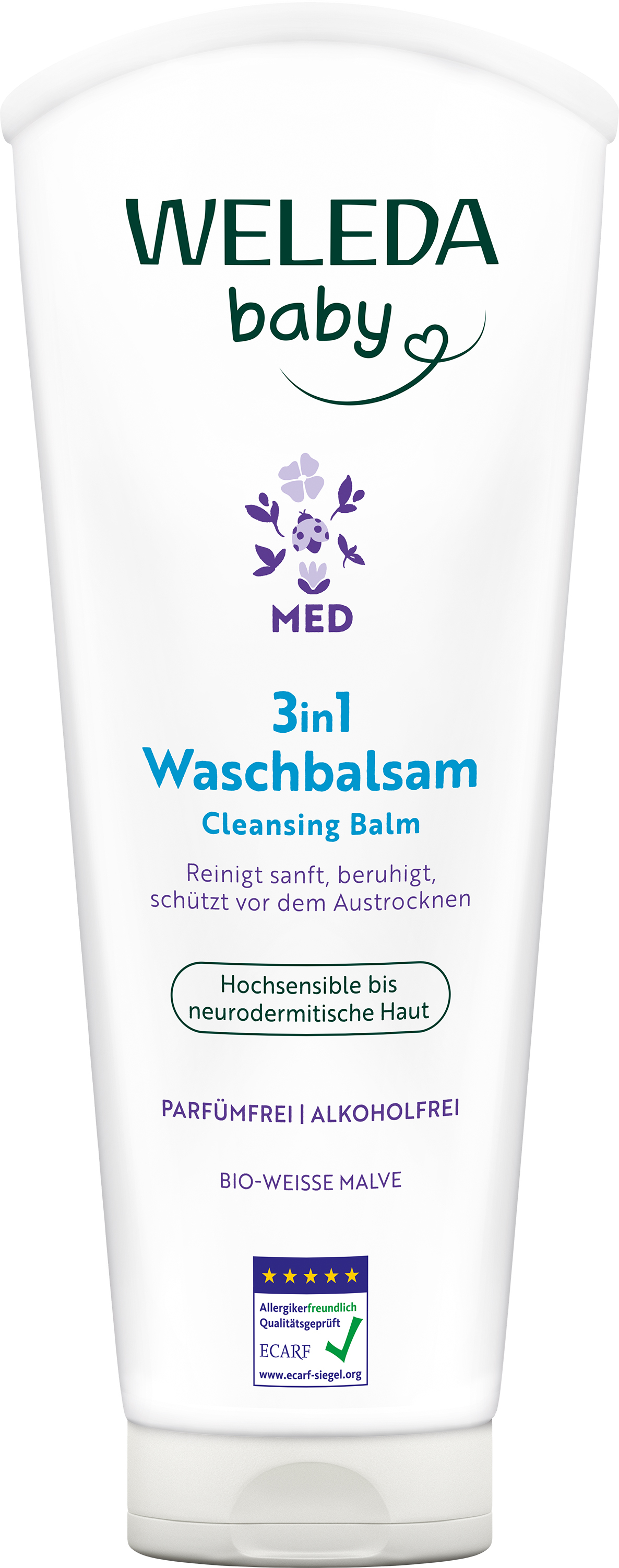 Reinige die hochsensible bis neurodermitische Haut deines Babys mit dem Med 3in1 Waschbalsam Weisse Malve von Weleda Baby! Seine seifenfreie Formel mit Weisser Bio-Malve, Bio-Nachtkerzenöl und Extrakt aus Mondo Graswurzel reinigt die Haut besonders sanft, ohne auszutrocknen. Gleichzeitig versorgt der Waschbalsam die Haut mit wertvollen Lipiden und wirkt somit rückfettend. Die Haut wird beruhigt und die Hautbarriere gestärkt.
