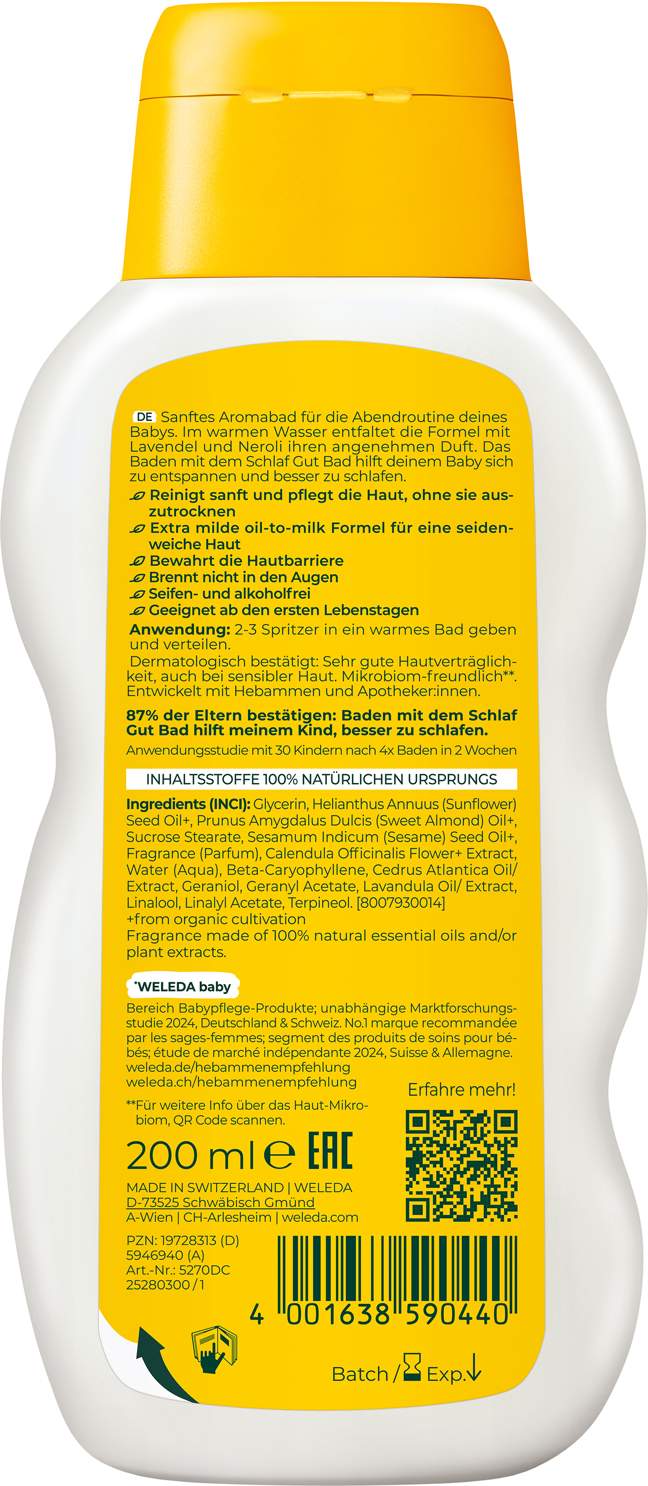 Schenke deinem Baby ein entspannendes Baderitual am Abend mit dem Calendula Schlaf Gut Bad von Weleda! Die sanfte Formel wurde mit Hebammen und Apotheker:innen entwickelt, reinigt sanft, ohne auszutrocknen und sorgt für eine seidenweiche Haut. Im warmen Wasser entfaltet die Formel mit Lavendel und Neroli ihren angenehmen Duft.