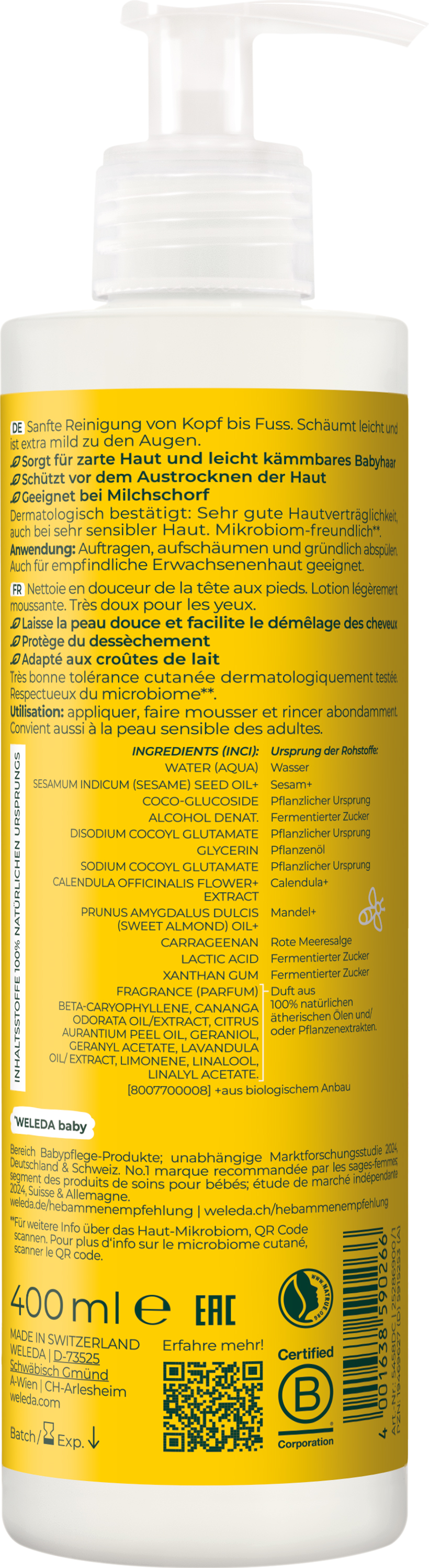 Milde Waschsubstanzen auf pflanzlicher Basis reinigen Haut und Haare besonders schonend und sind extra mild zu den Augen.