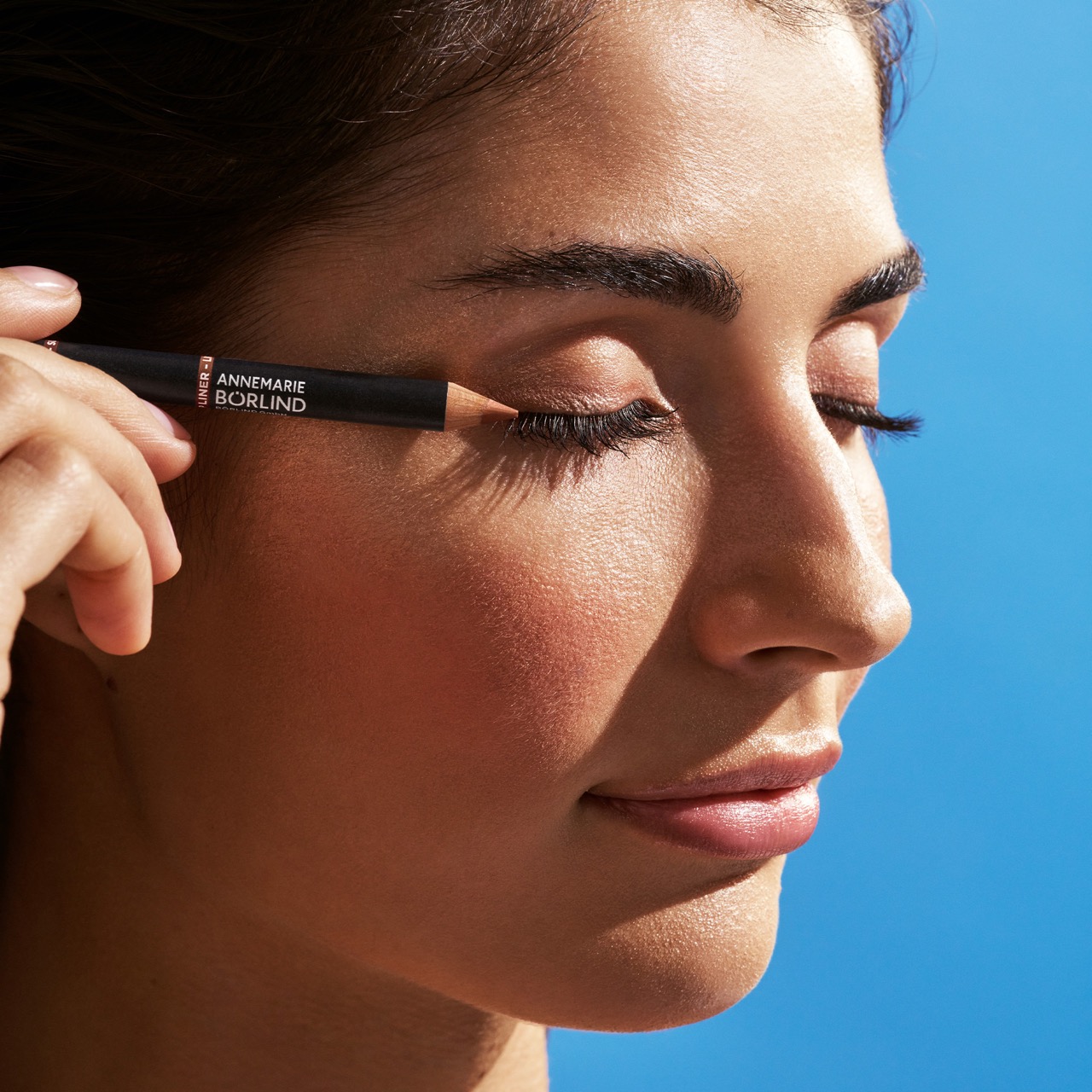 Eine Linie sanft entlang des äußeren Wimpernkranzes oder auch entlang der Wasserlinie ziehen. Die Lippenkontur von den Mundwinkeln zur Mitte nachziehen.