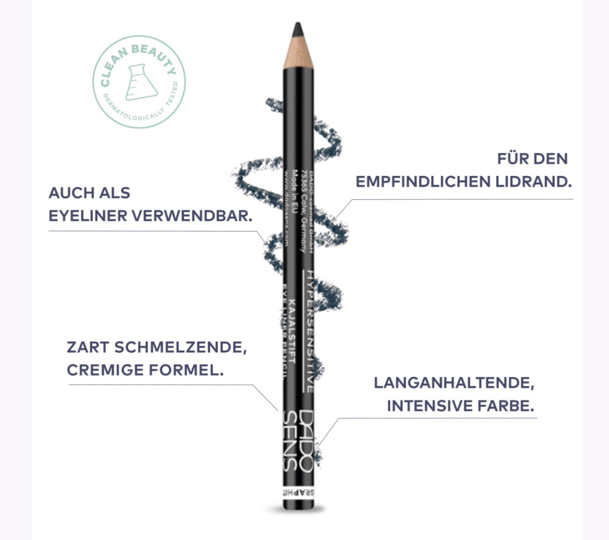 Verwender:innen mit sehr empfindlichen Augenpartien haben die Chance, diese zu betonen. Die Kajalstifte intensivieren den Blick mit langanhaltender, intensiver Farbe. Die zart schmelzende, cremige Formel wurde speziell für den sehr empfindlichen inneren Lidrand entwickelt.